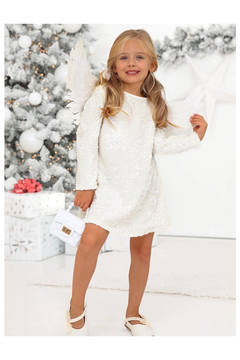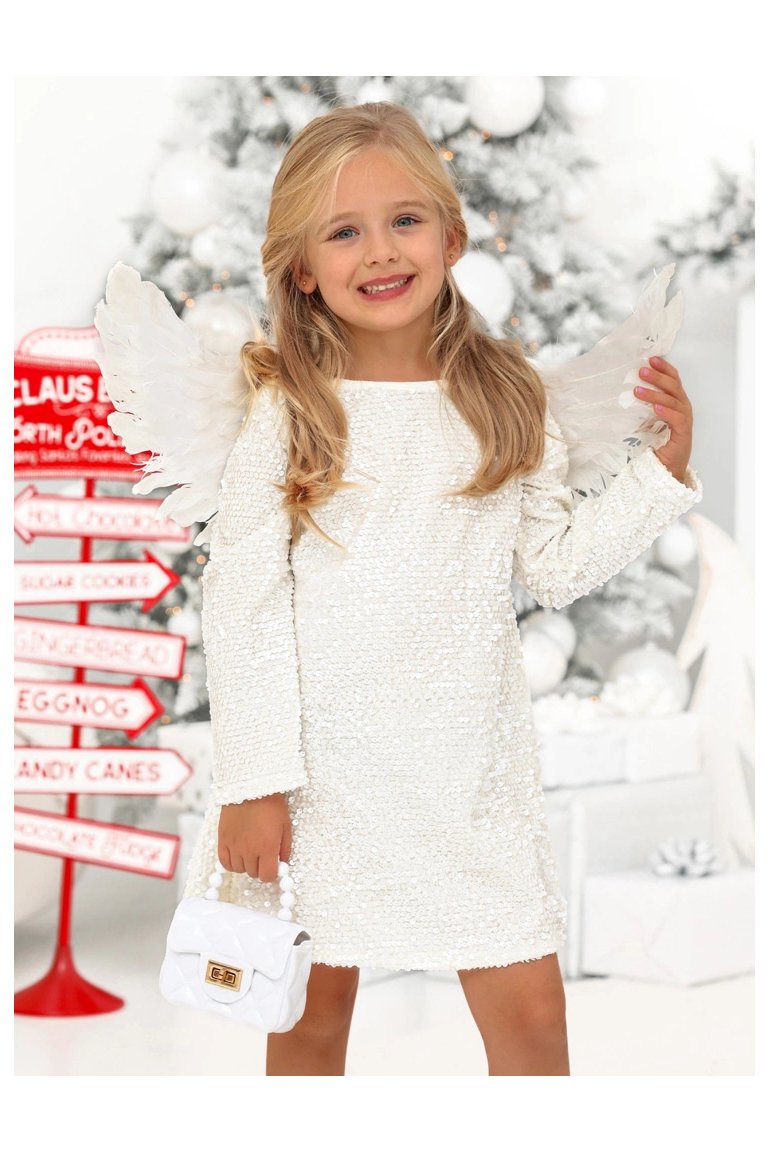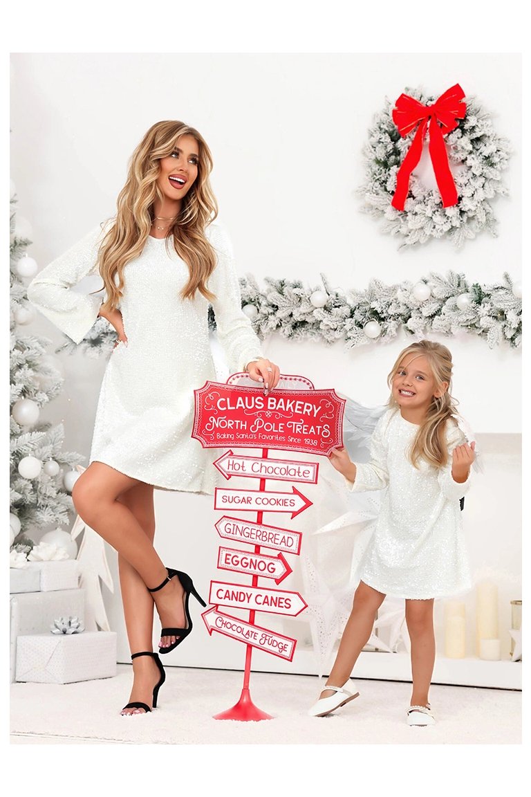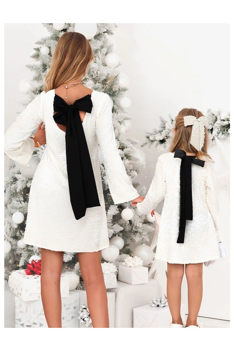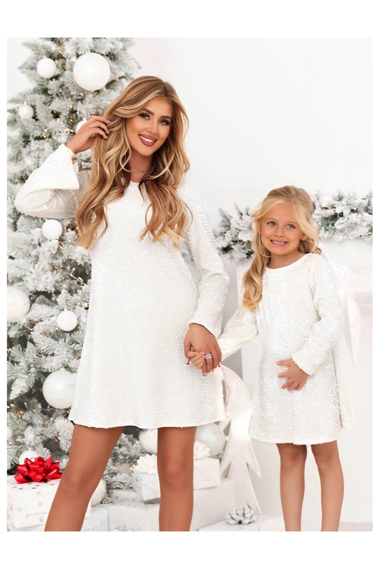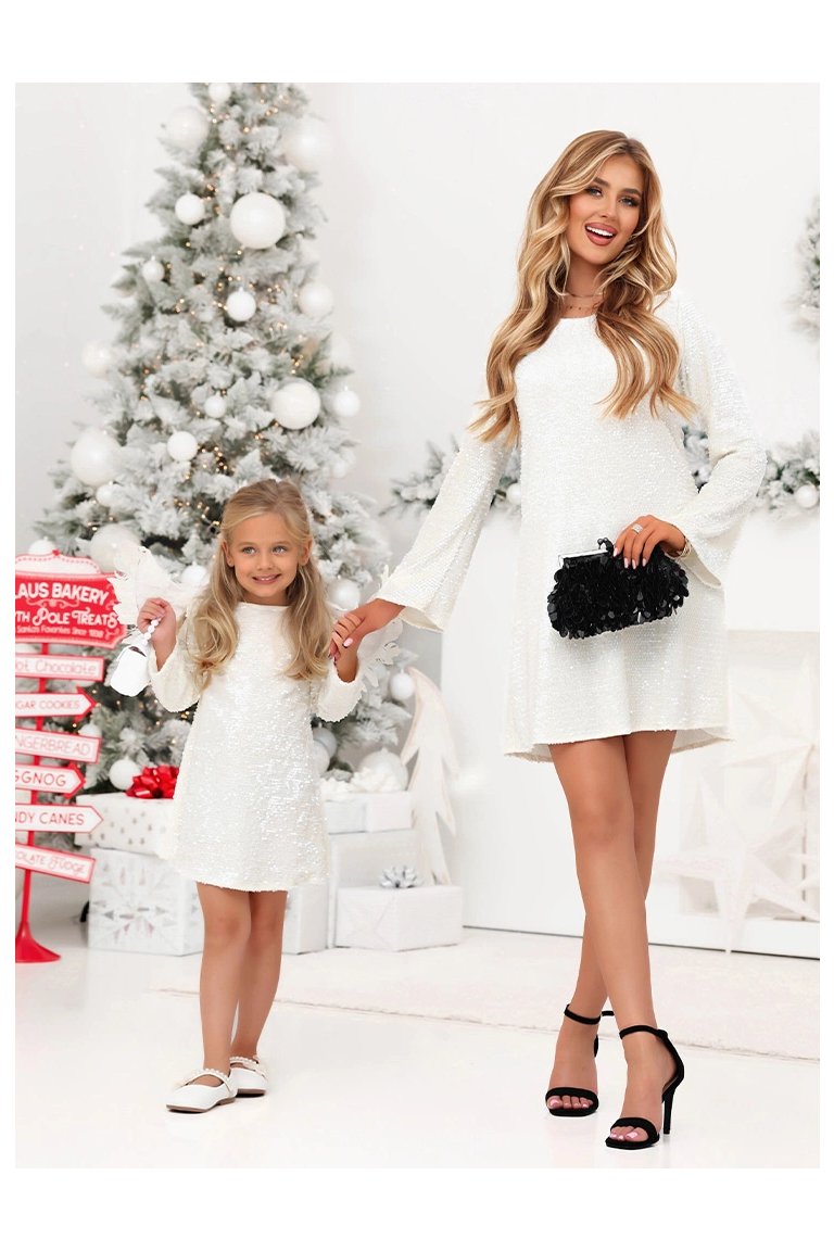 Flitrové šaty pre mamu a dcéru White. Set nádherných flitrovaných šiat pre mamičku a dcérku obľúbeného voľného strihu so zaväzovaním na chrbte. Set obsahuje jedny šaty pre maminku a jedny pre dcérku. Šaty sú vhodné na vianočné fotenie, fotenie v škôlke, či škole, na Štedrý deň, sviatky, ale využijete ich aj na iné príležitosti. Darujte si vianočný darček a vyzerajte krásne so svojou dcérou počas týchto sviatkov. Šaty sú príjemné a pohodlné, šité v EÚ.