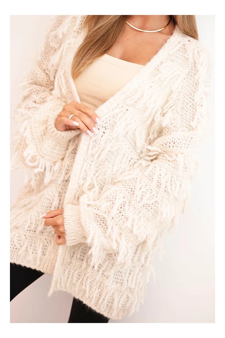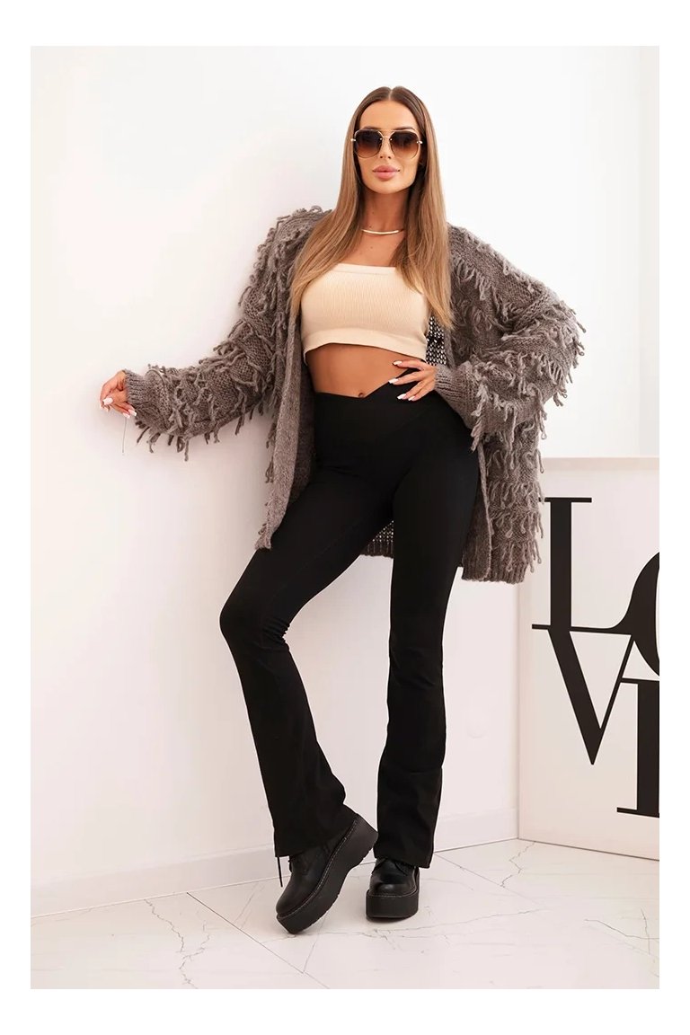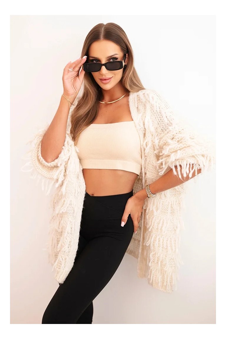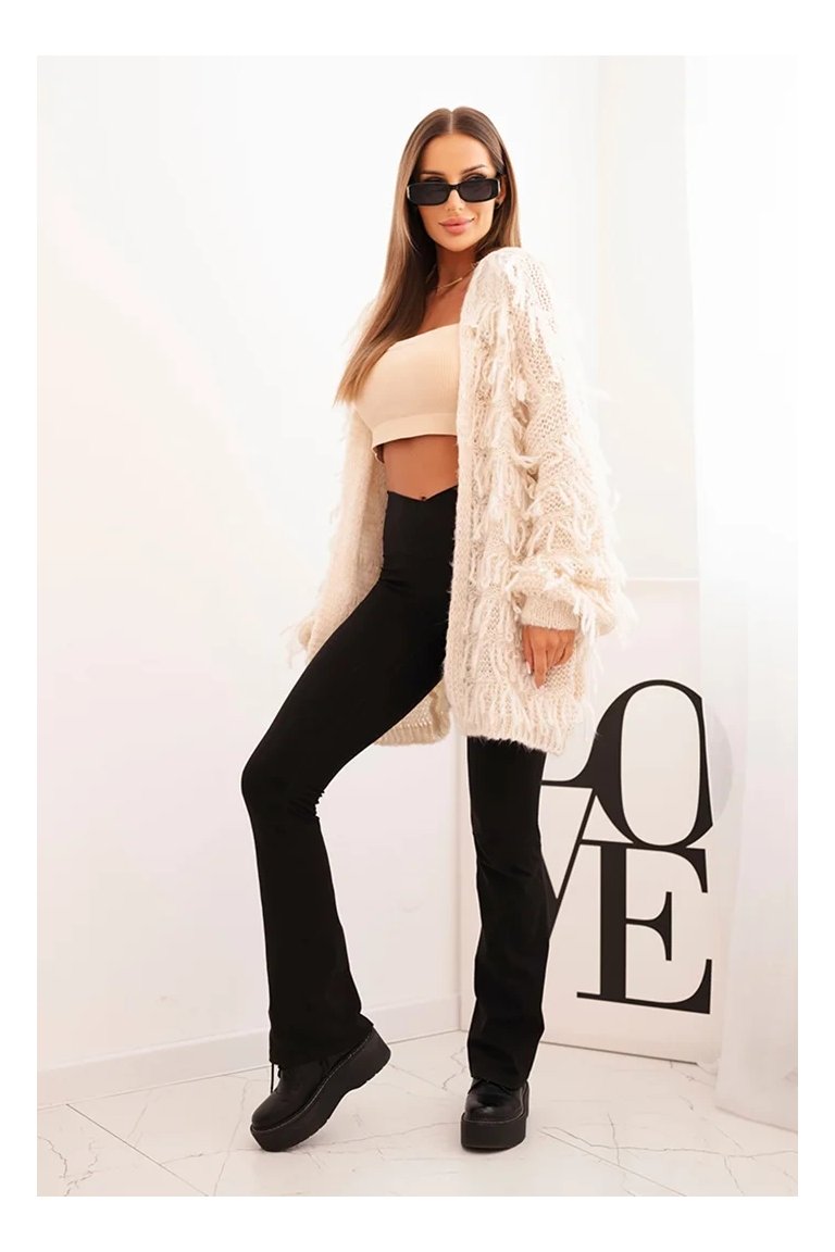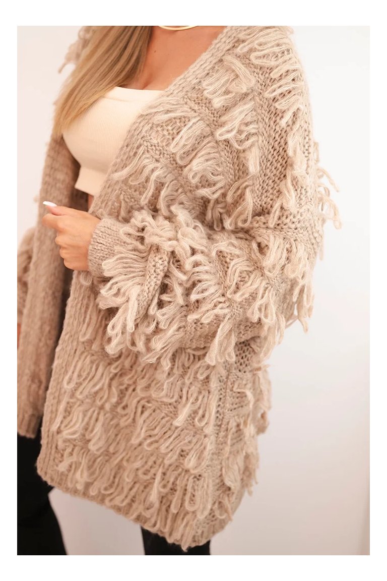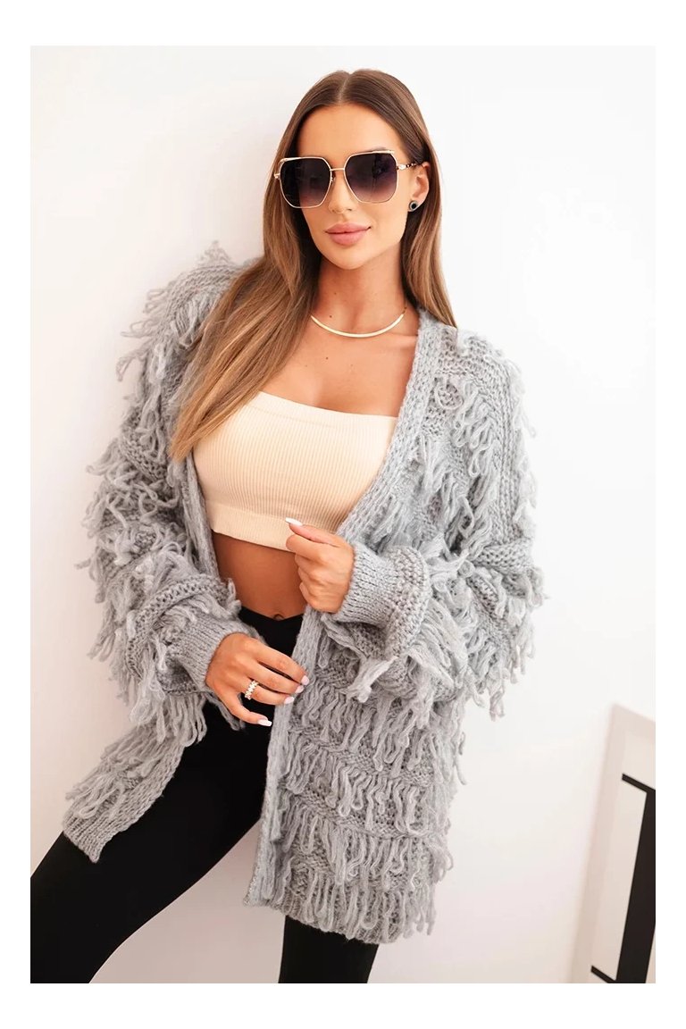 Kardigán so strapcami. Dámsky pohodlný kardigán so strapcami v obľúbenom oversize strihu, vyrobený z mäkkej a teplej priadze. Kardigán je univerzálnej veľkosti, takže by mal byť vhodný pre ženy, ktoré nosia veľkosť S, M a L.
