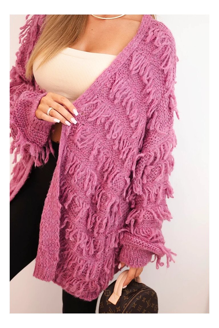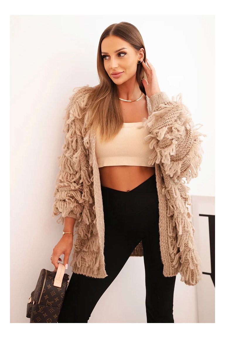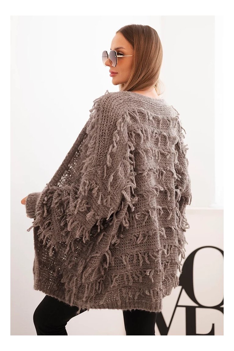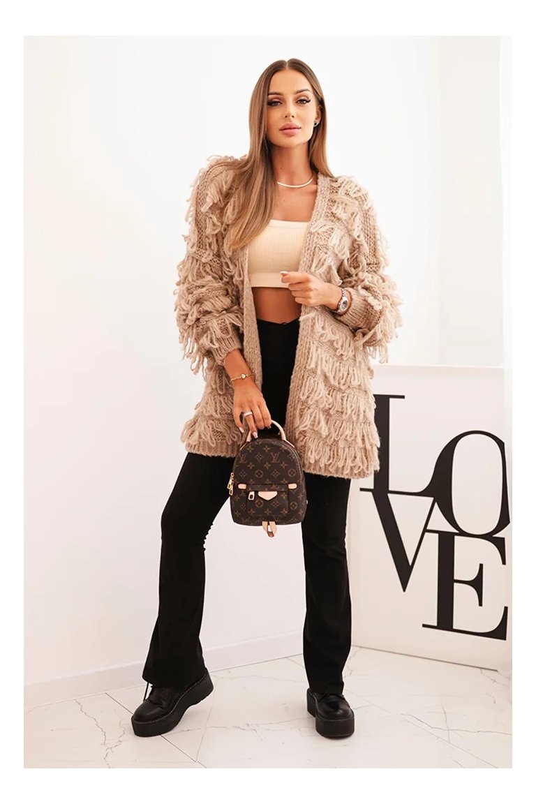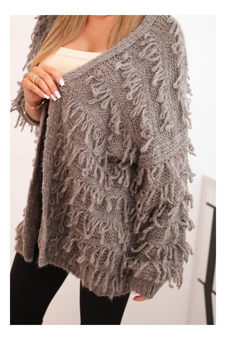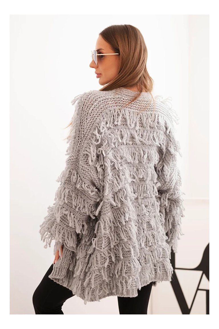 Kardigán so strapcami. Dámsky pohodlný kardigán so strapcami v obľúbenom oversize strihu, vyrobený z mäkkej a teplej priadze. Kardigán je univerzálnej veľkosti, takže by mal byť vhodný pre ženy, ktoré nosia veľkosť S, M a L.