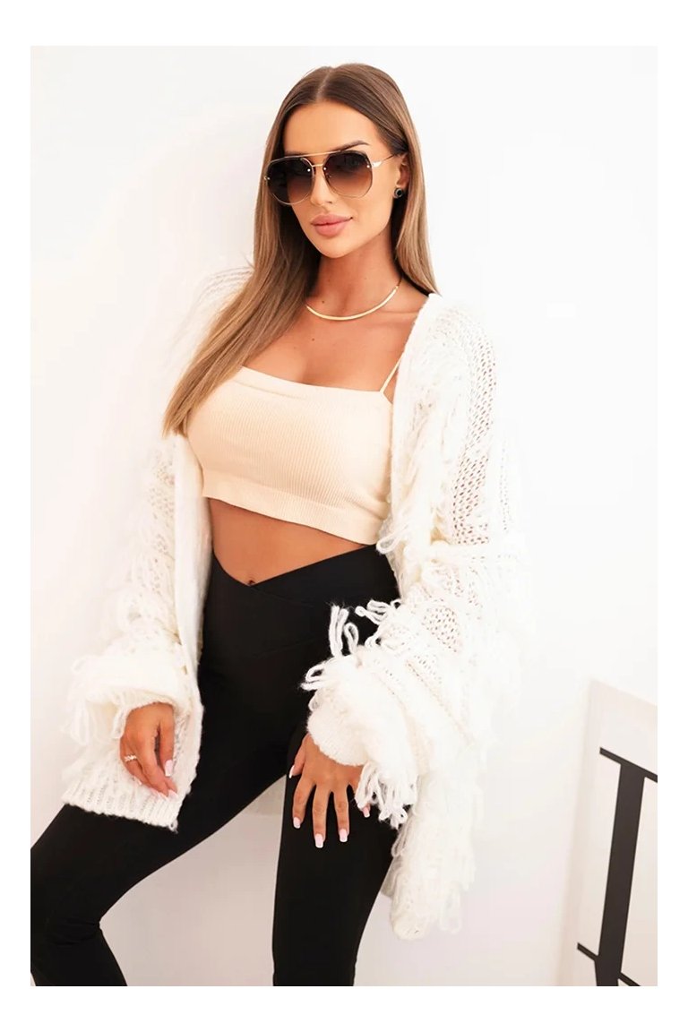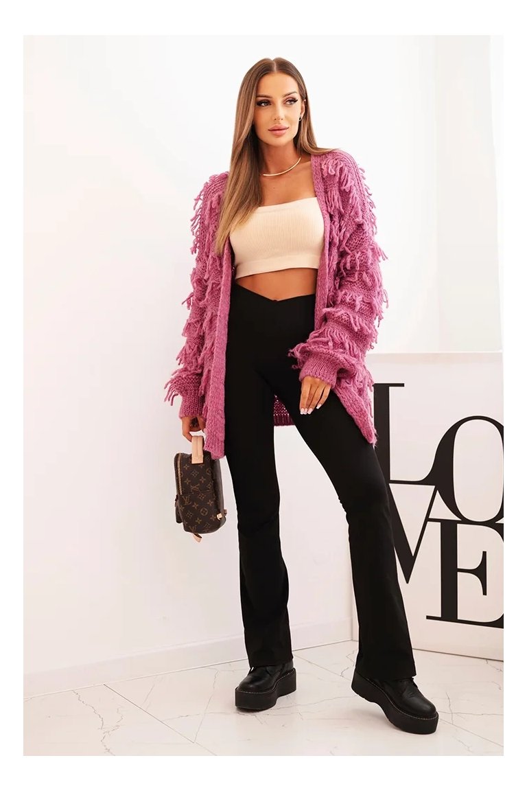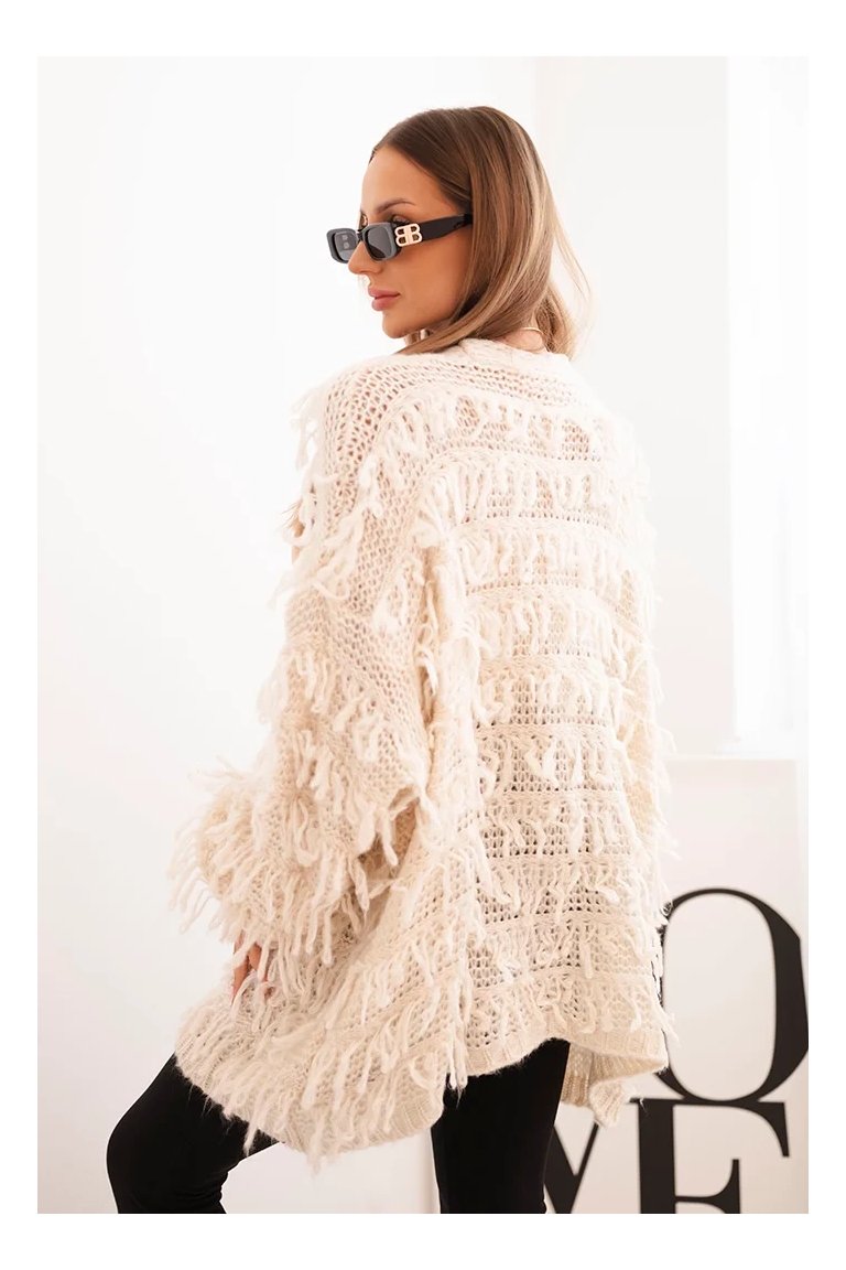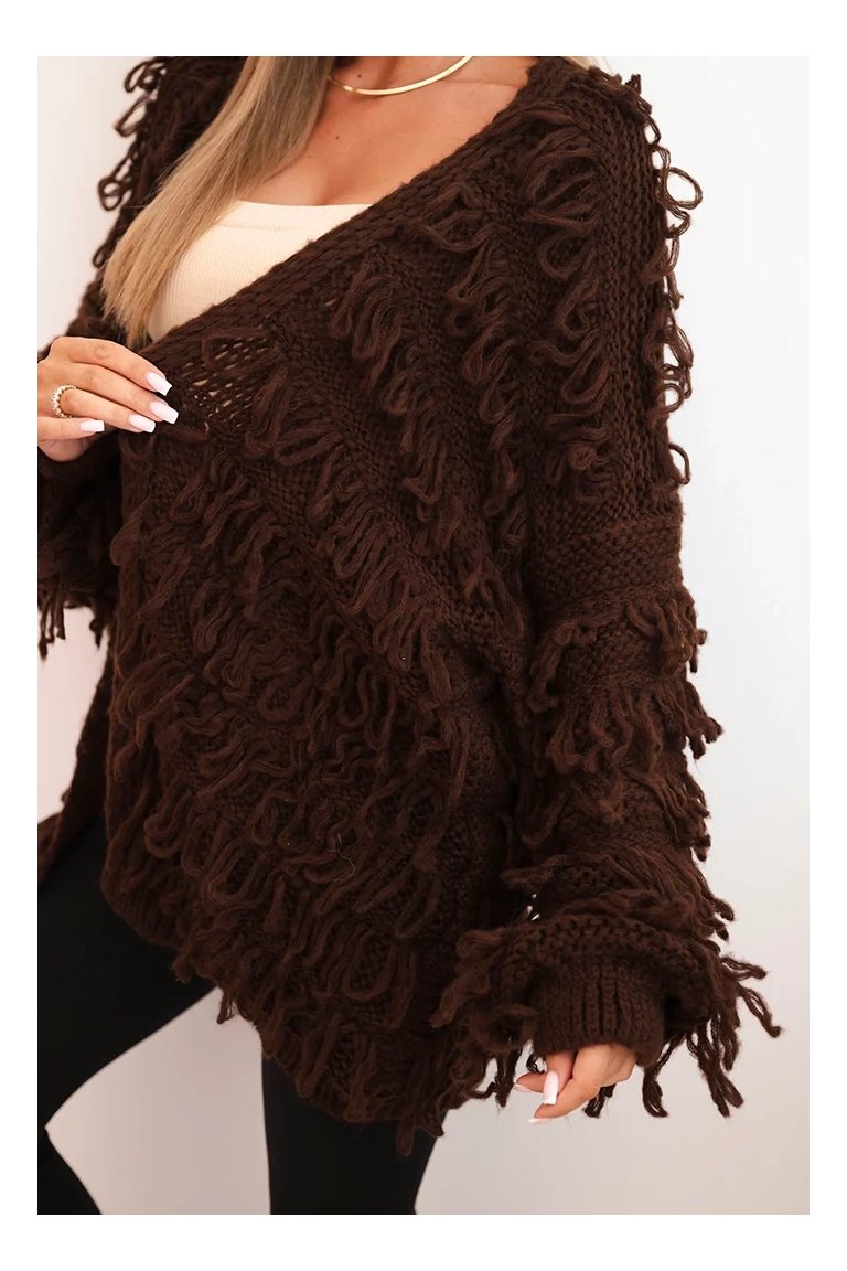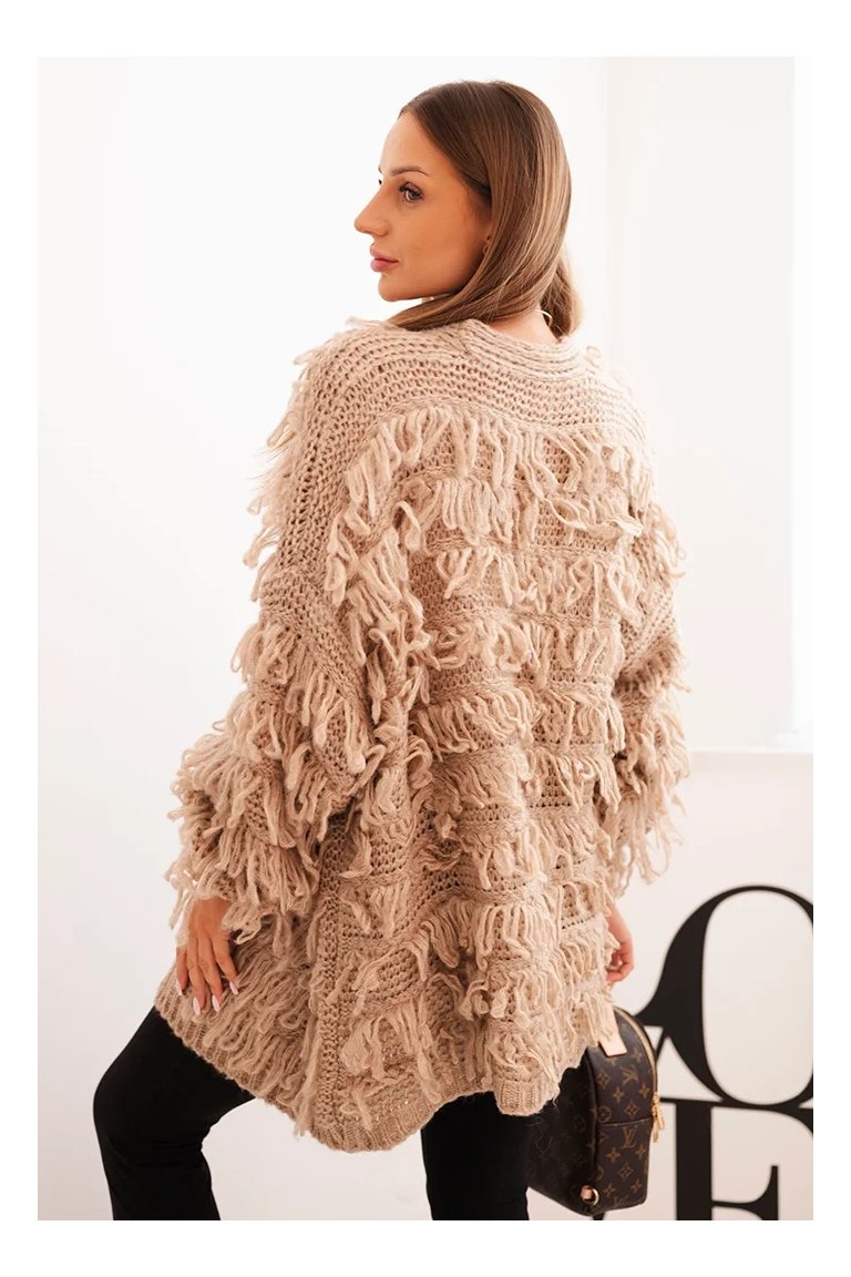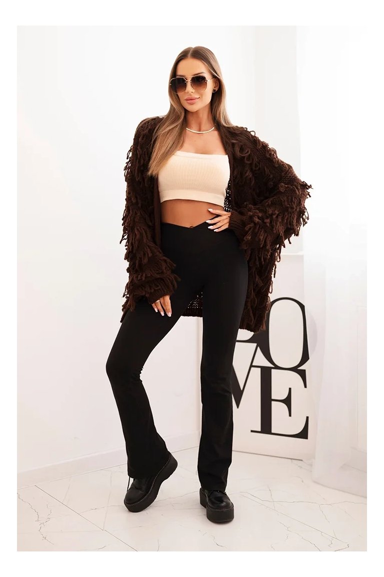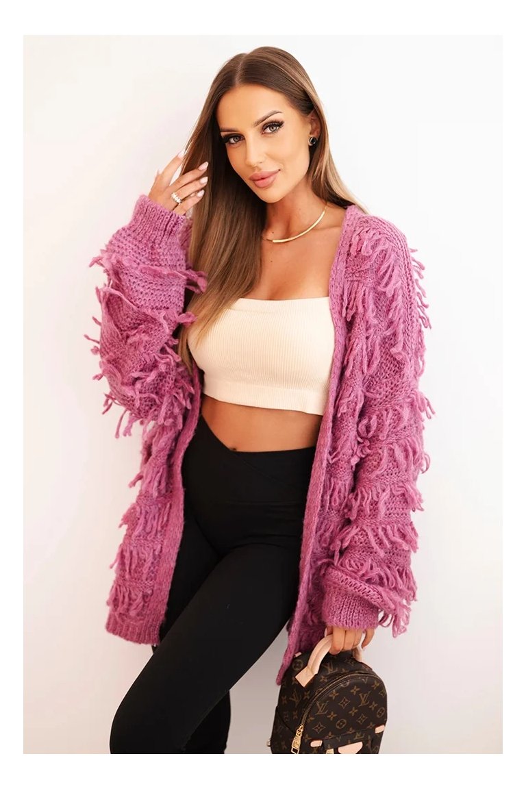 Kardigán so strapcami. Dámsky pohodlný kardigán so strapcami v obľúbenom oversize strihu, vyrobený z mäkkej a teplej priadze. Kardigán je univerzálnej veľkosti, takže by mal byť vhodný pre ženy, ktoré nosia veľkosť S, M a L.