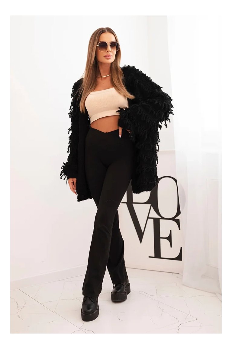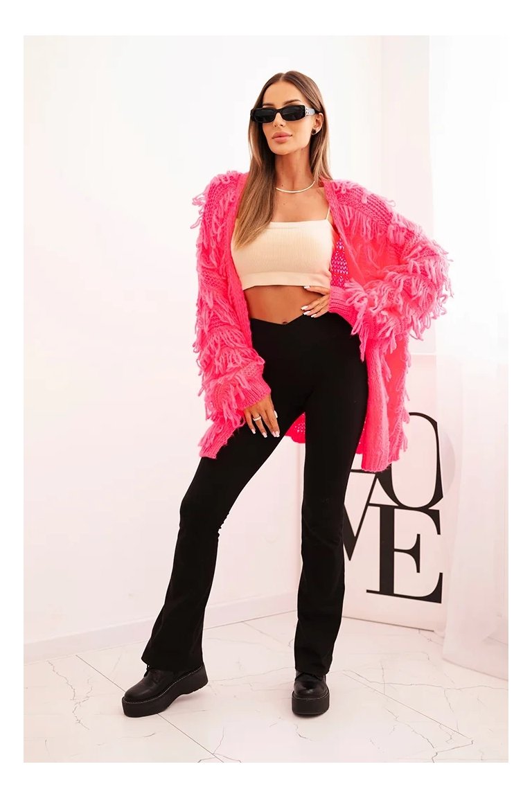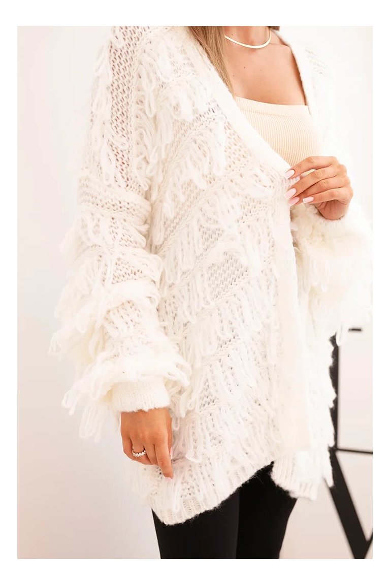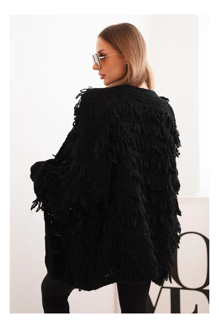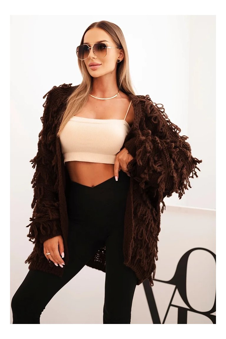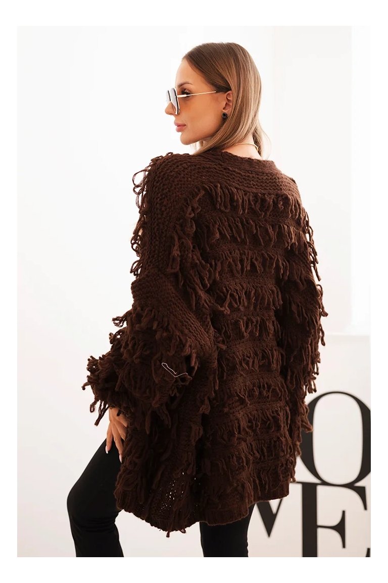 Kardigán so strapcami. Dámsky pohodlný kardigán so strapcami v obľúbenom oversize strihu, vyrobený z mäkkej a teplej priadze. Kardigán je univerzálnej veľkosti, takže by mal byť vhodný pre ženy, ktoré nosia veľkosť S, M a L.
