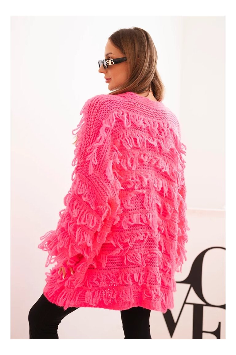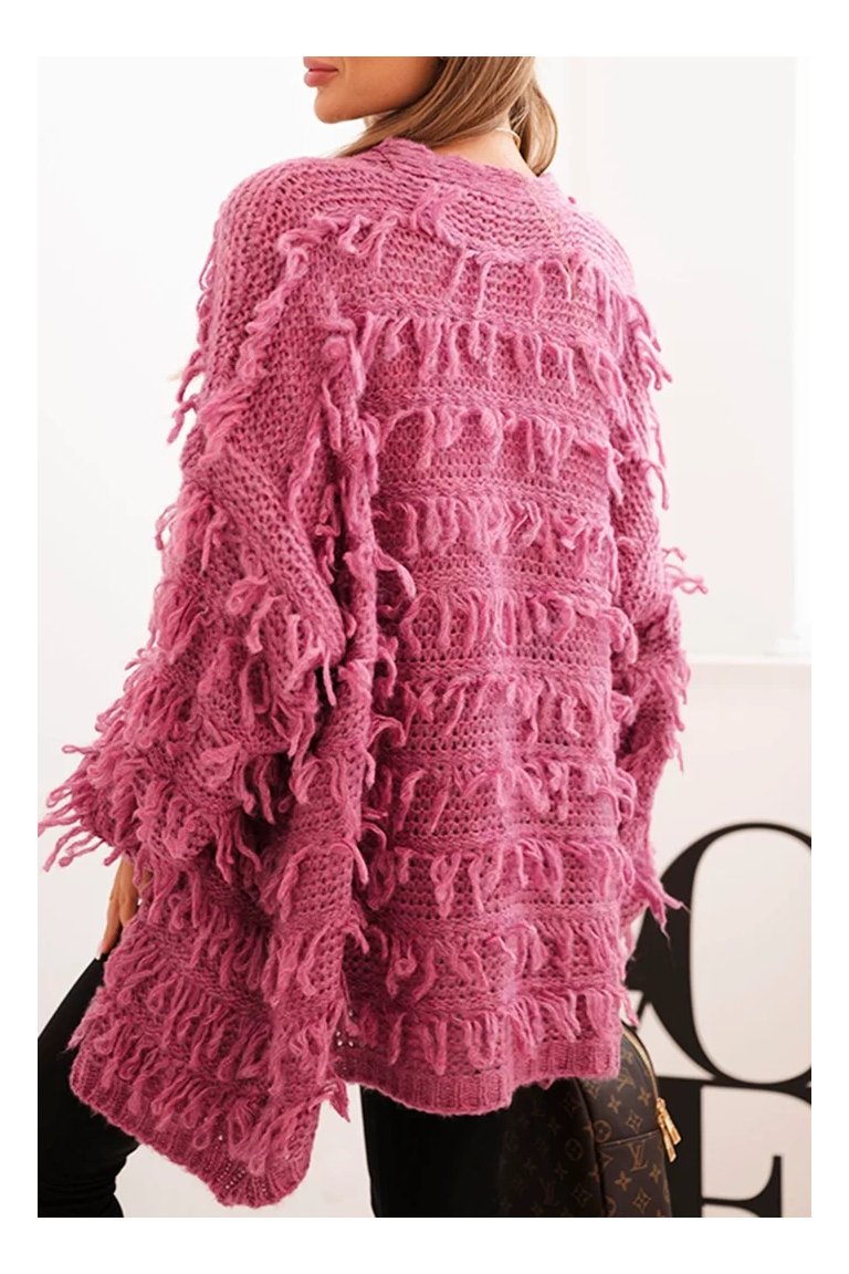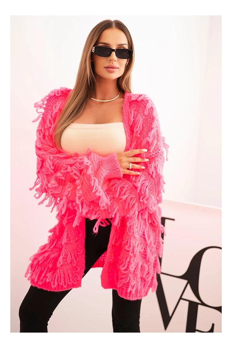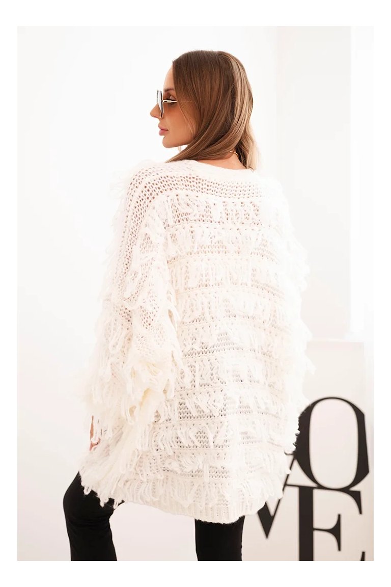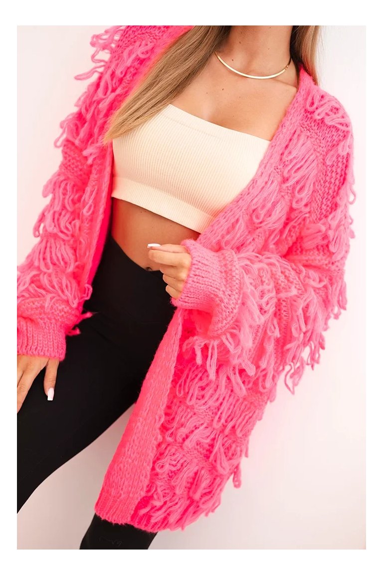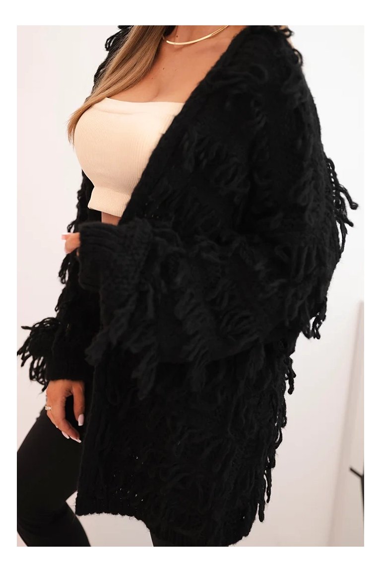 Kardigán so strapcami. Dámsky pohodlný kardigán so strapcami v obľúbenom oversize strihu, vyrobený z mäkkej a teplej priadze. Kardigán je univerzálnej veľkosti, takže by mal byť vhodný pre ženy, ktoré nosia veľkosť S, M a L.