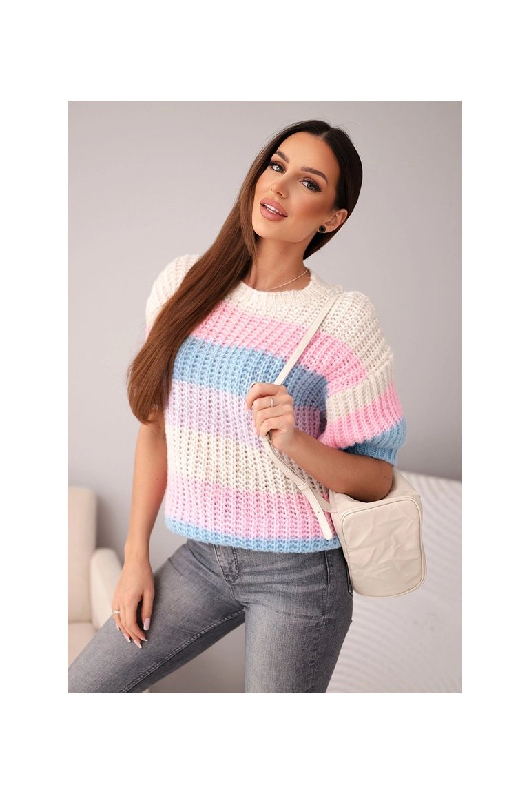 Pruhovaný sveter s krátkym rukávom. Dámsky pohodlný sveter s krátkymi, širokými rukávmi. Kombinácia pastelových farieb mu dodáva dievčenskú príťažlivosť a ľahkosť a mäkká priadza zabezpečuje príjemné nosenie. Je univerzálnej veľkosti, takže by mal byť vhodný pre ženy, ktoré nosia veľkosť S, M a L.