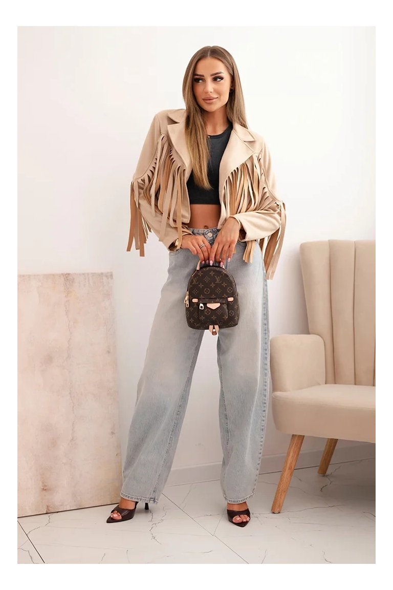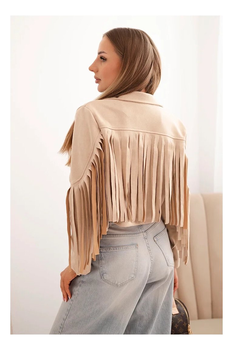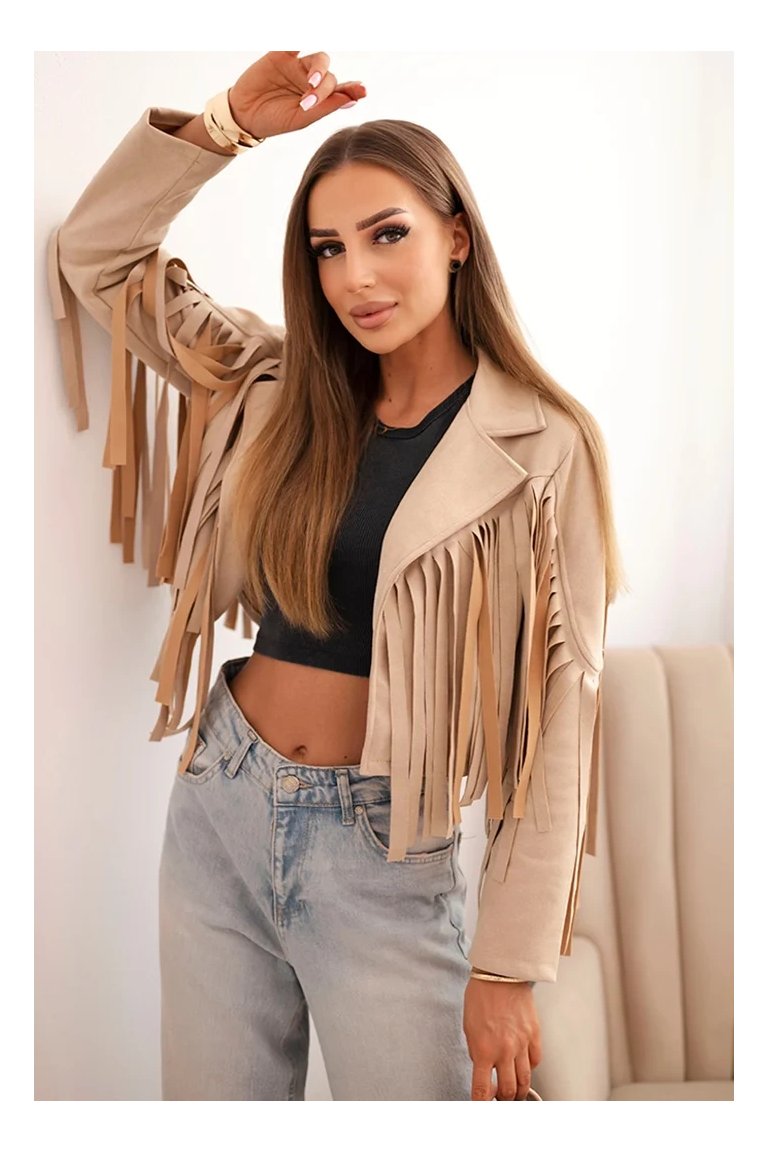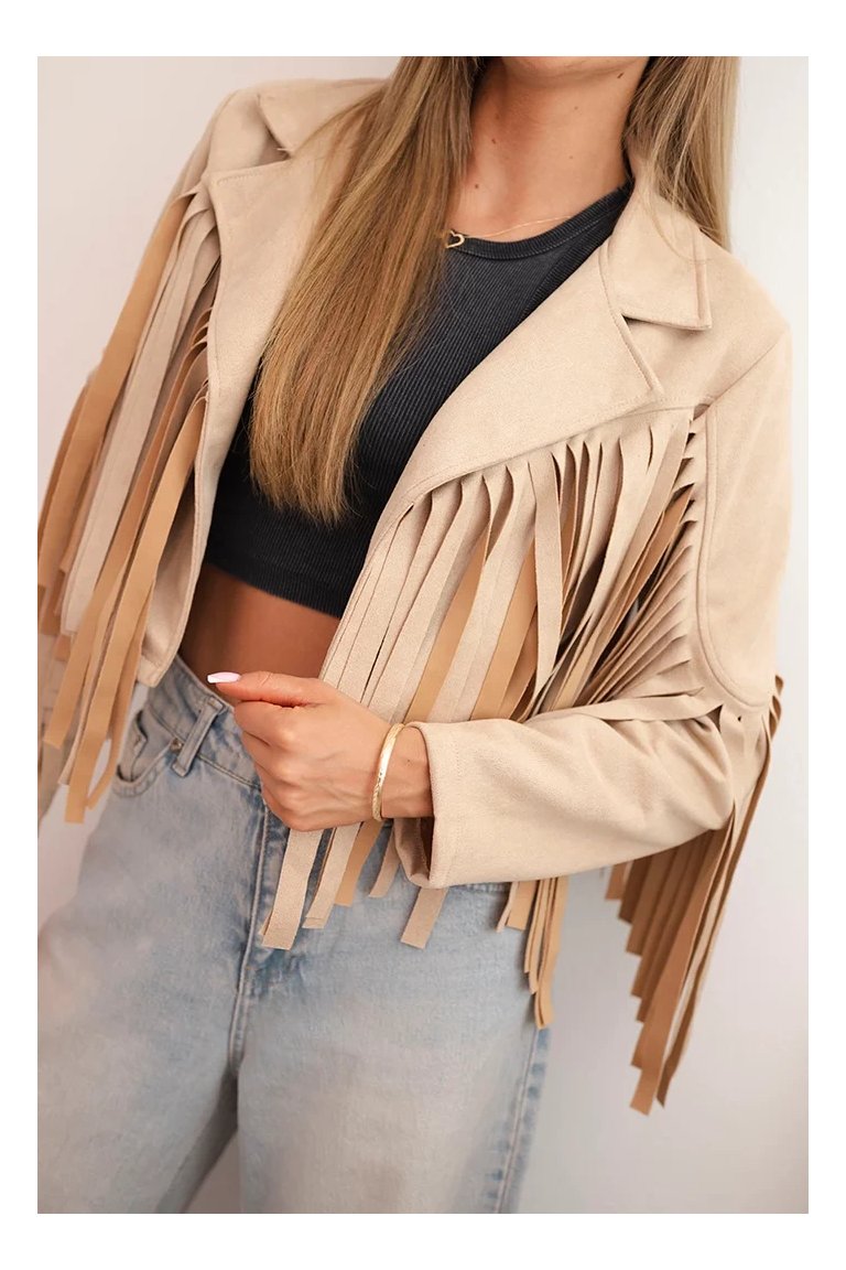 Semišová bunda so strapcami. Dámska krátka ľahká bunda so strapcami, vyrobená z mäkkého materiálu pripomínajúceho semiš, dokonale zapadá do najnovších boho a western trendov. Krátky strih krásne zvýrazňuje postavu a výrazné strapce pozdĺž rukávov a prednej časti jej dodávajú uvoľnený a štýlový vzhľad. Skvele sa hodí na bežné nosenie aj na festivaly. Je univerzálnej veľkosti, takže by mala byť vhodná pre ženy, ktoré nosia veľkosť XS, S a M.
