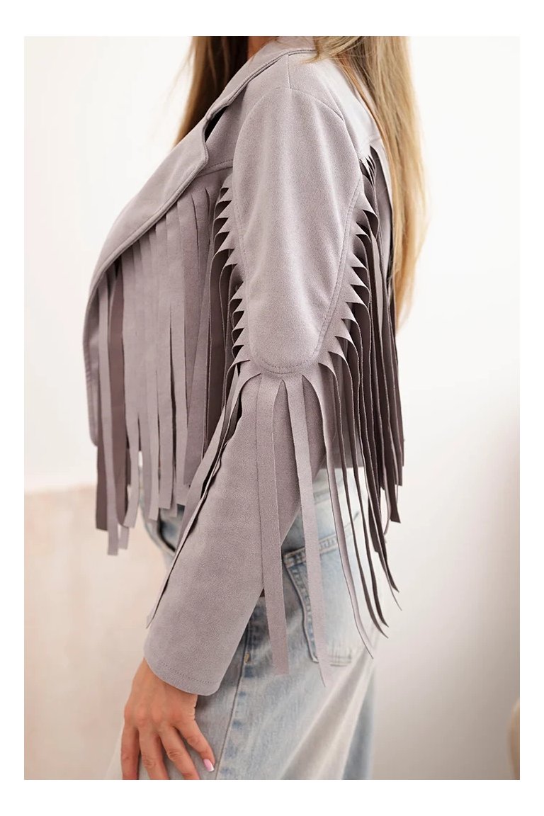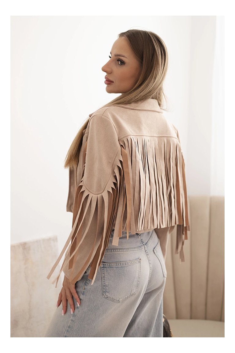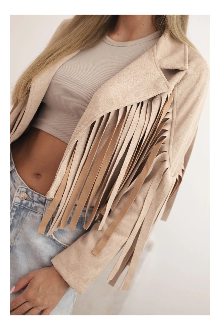 Semišová bunda so strapcami. Dámska krátka ľahká bunda so strapcami, vyrobená z mäkkého materiálu pripomínajúceho semiš, dokonale zapadá do najnovších boho a western trendov. Krátky strih krásne zvýrazňuje postavu a výrazné strapce pozdĺž rukávov a prednej časti jej dodávajú uvoľnený a štýlový vzhľad. Skvele sa hodí na bežné nosenie aj na festivaly. Je univerzálnej veľkosti, takže by mala byť vhodná pre ženy, ktoré nosia veľkosť XS, S a M.