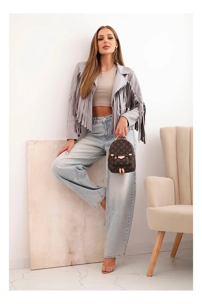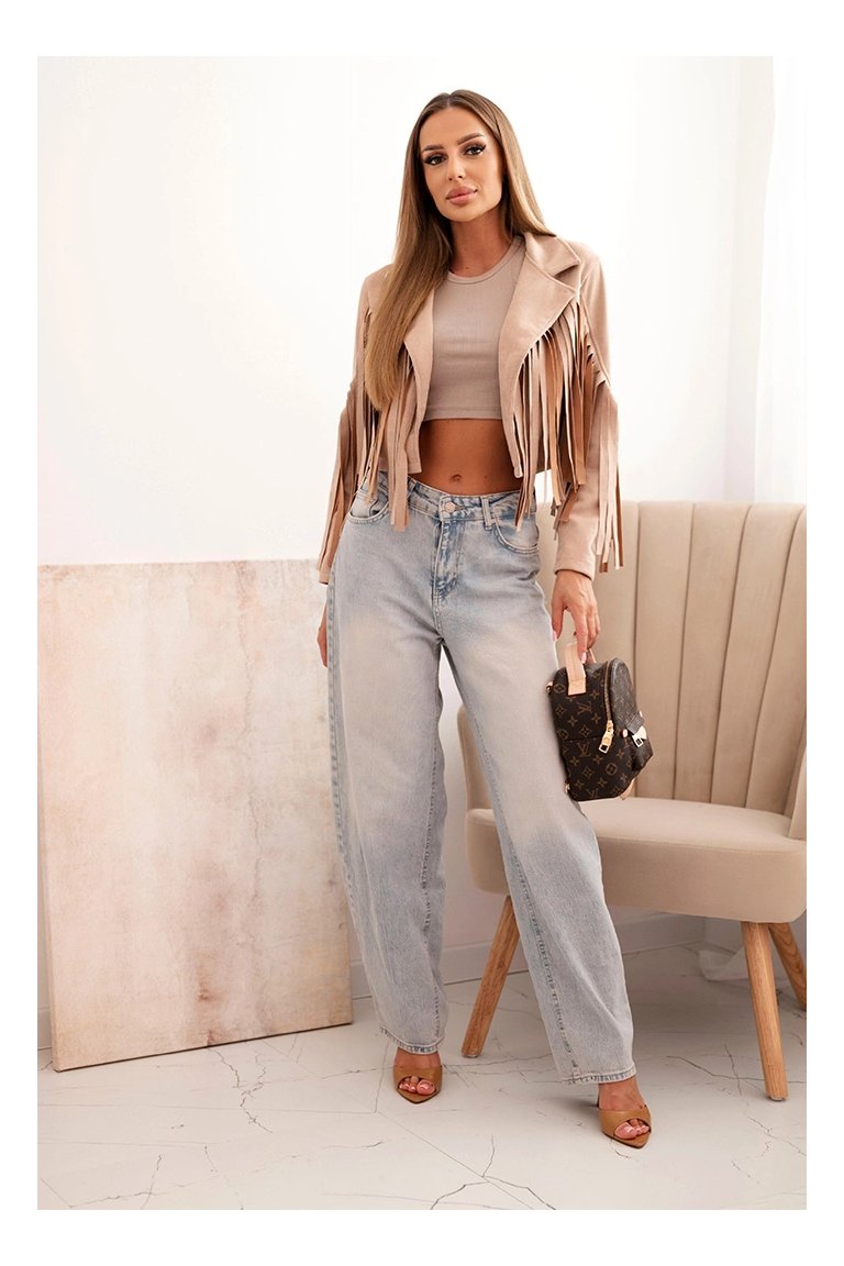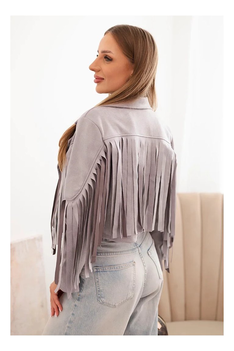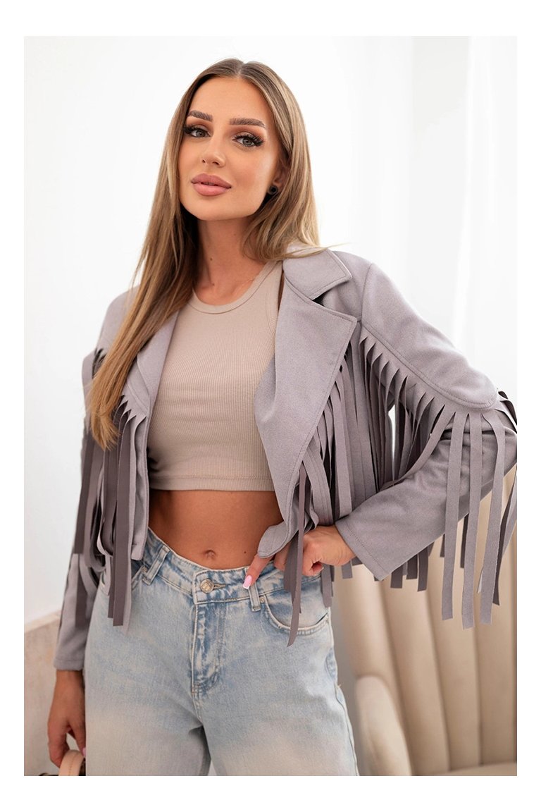 Semišová bunda so strapcami. Dámska krátka ľahká bunda so strapcami, vyrobená z mäkkého materiálu pripomínajúceho semiš, dokonale zapadá do najnovších boho a western trendov. Krátky strih krásne zvýrazňuje postavu a výrazné strapce pozdĺž rukávov a prednej časti jej dodávajú uvoľnený a štýlový vzhľad. Skvele sa hodí na bežné nosenie aj na festivaly. Je univerzálnej veľkosti, takže by mala byť vhodná pre ženy, ktoré nosia veľkosť XS, S a M.