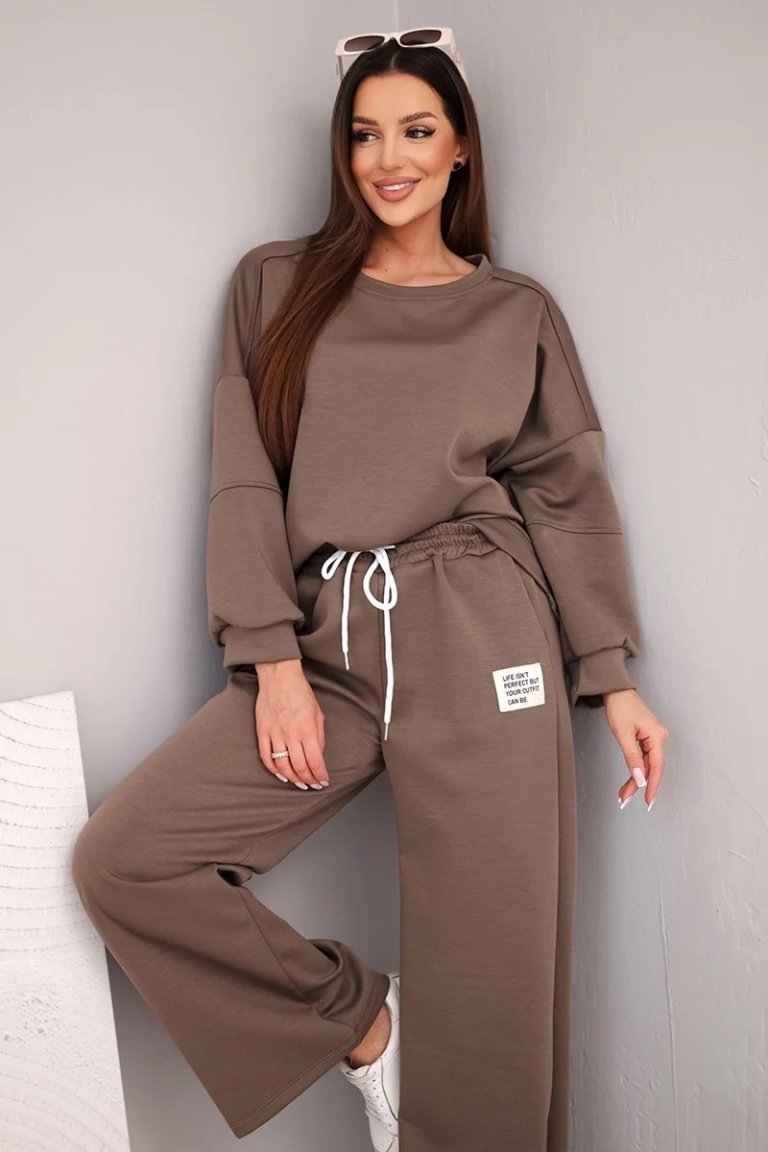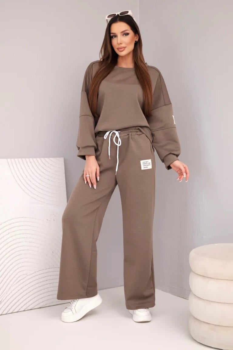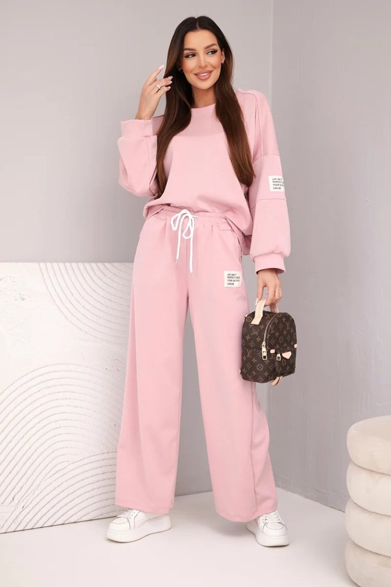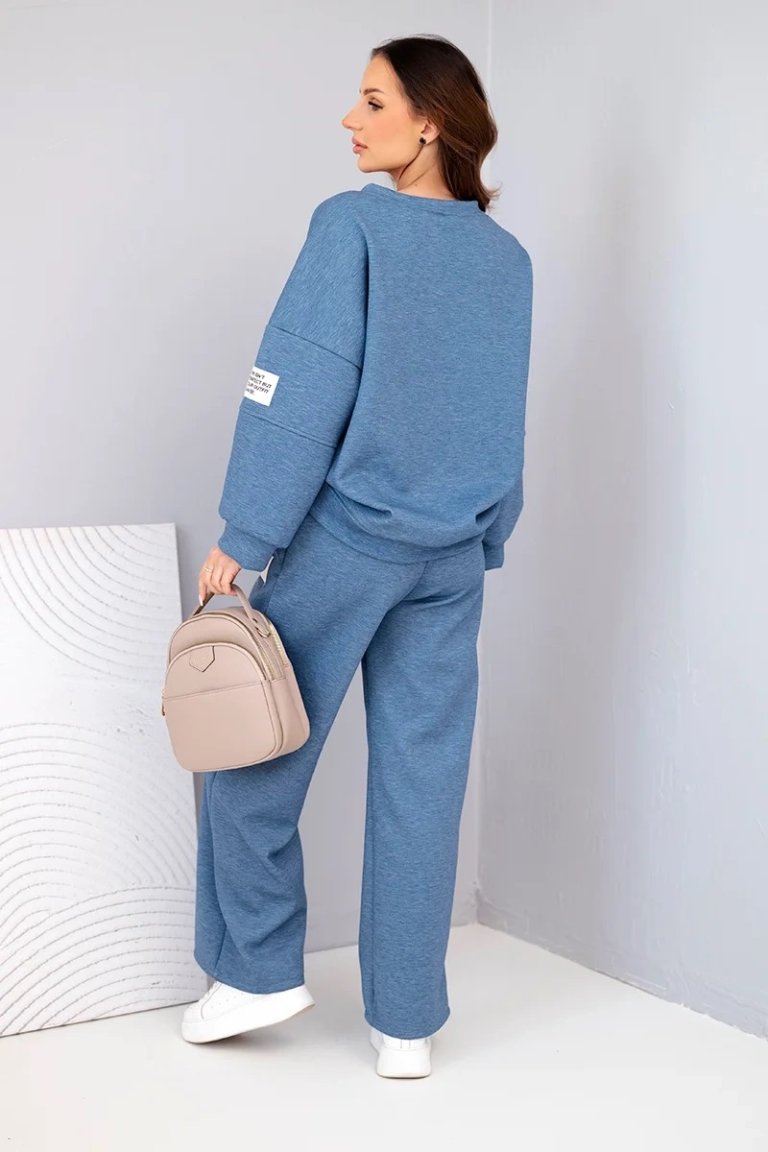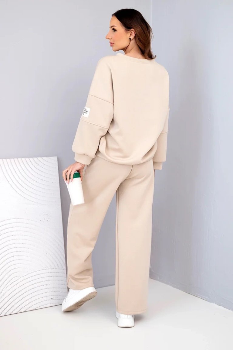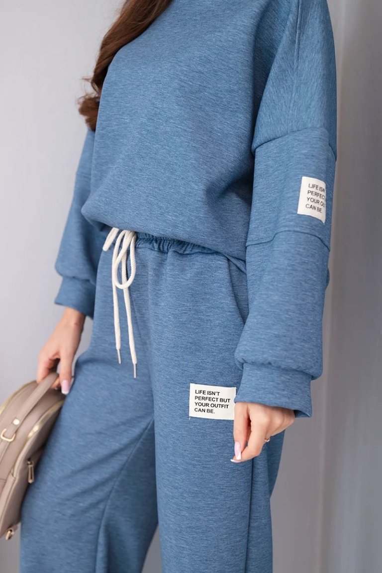 Tepláková súprava Astrid. Dámska pohodlná tepláková súprava s mikinou voľného strihu so spustenou líniou ramien a pohodlné nohavice so širokým strihom. Súprava je vyrobená z kvalitného a príjemného materiálu. Je univerzálnej veľkosti, takže by mala byť vhodná pre ženy, ktoré nosia veľkosť S, M a L.