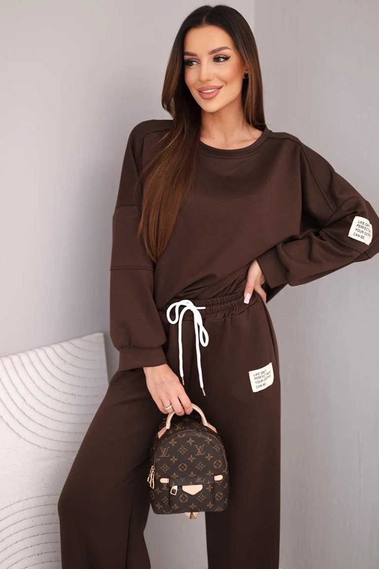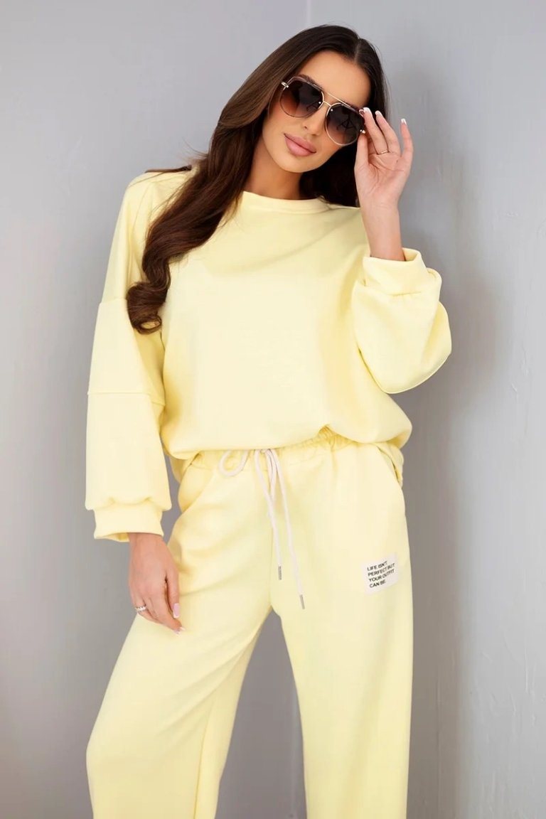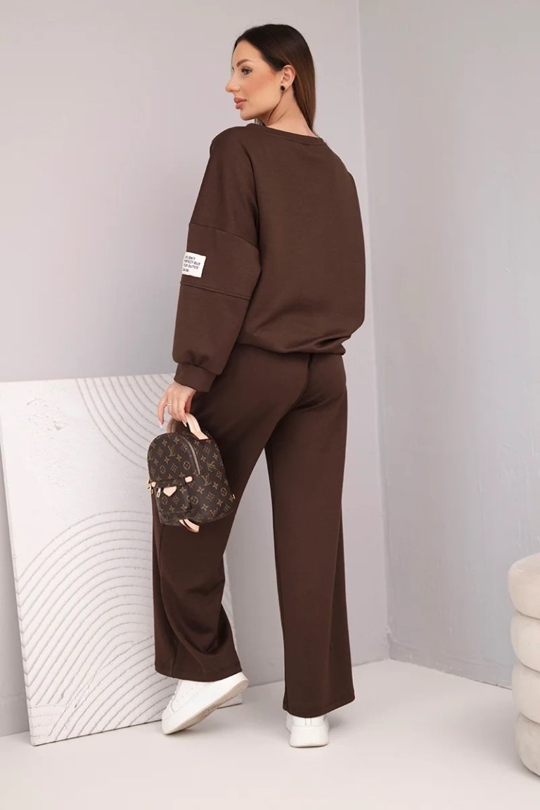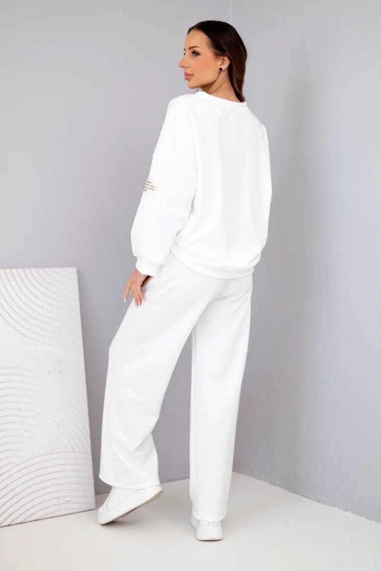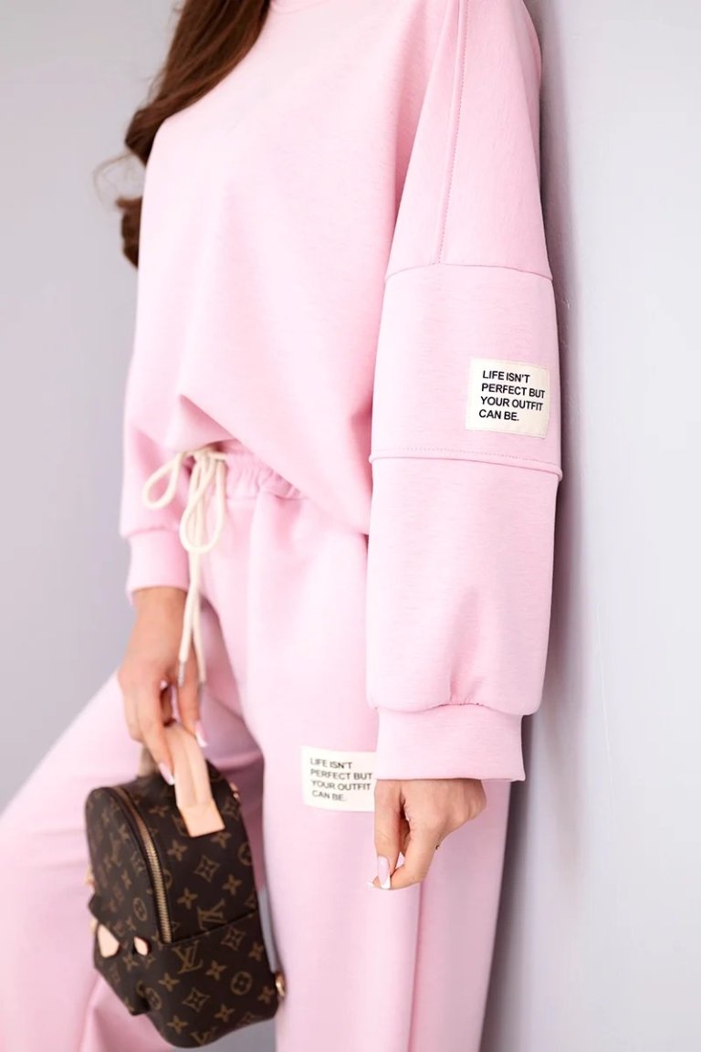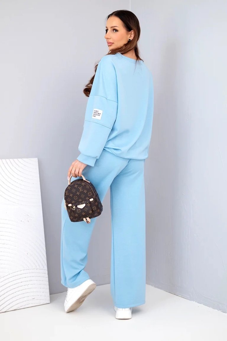 Tepláková súprava Astrid. Dámska pohodlná tepláková súprava s mikinou voľného strihu so spustenou líniou ramien a pohodlné nohavice so širokým strihom. Súprava je vyrobená z kvalitného a príjemného materiálu. Je univerzálnej veľkosti, takže by mala byť vhodná pre ženy, ktoré nosia veľkosť S, M a L.