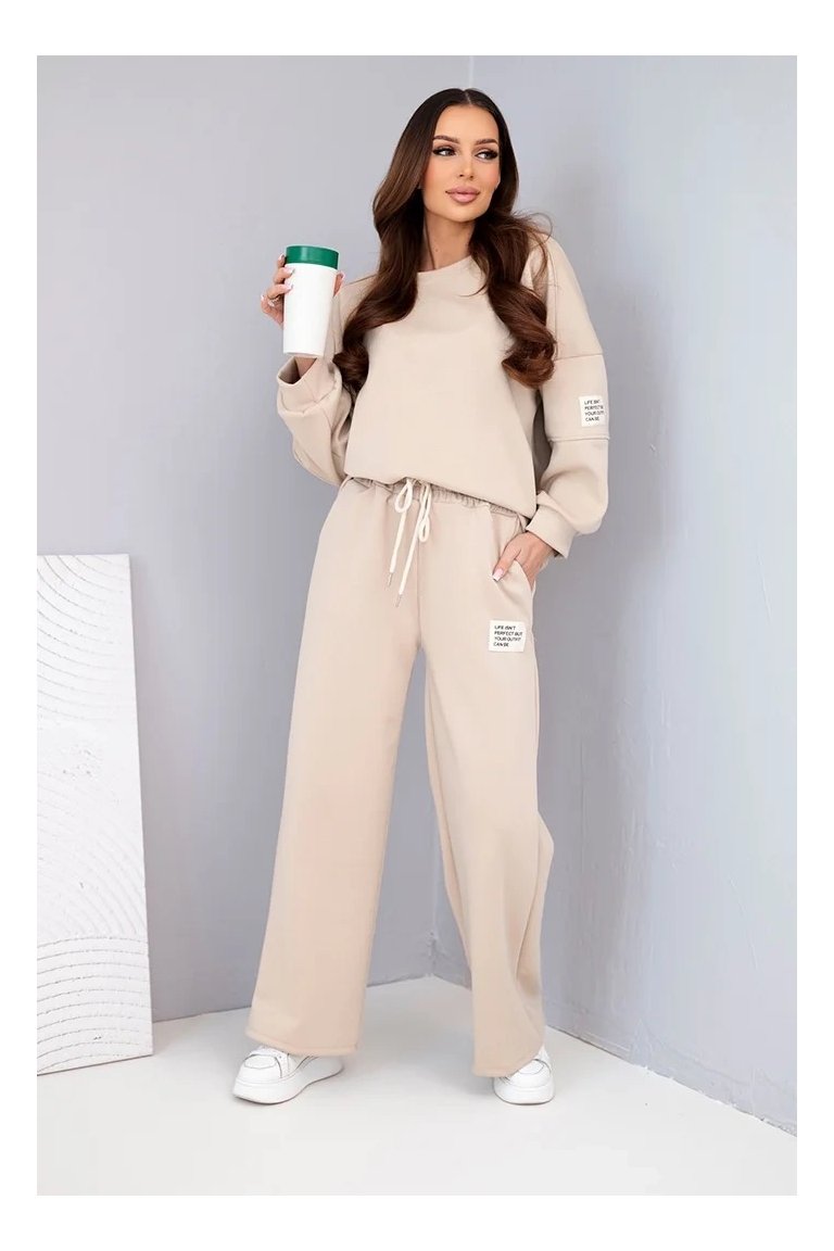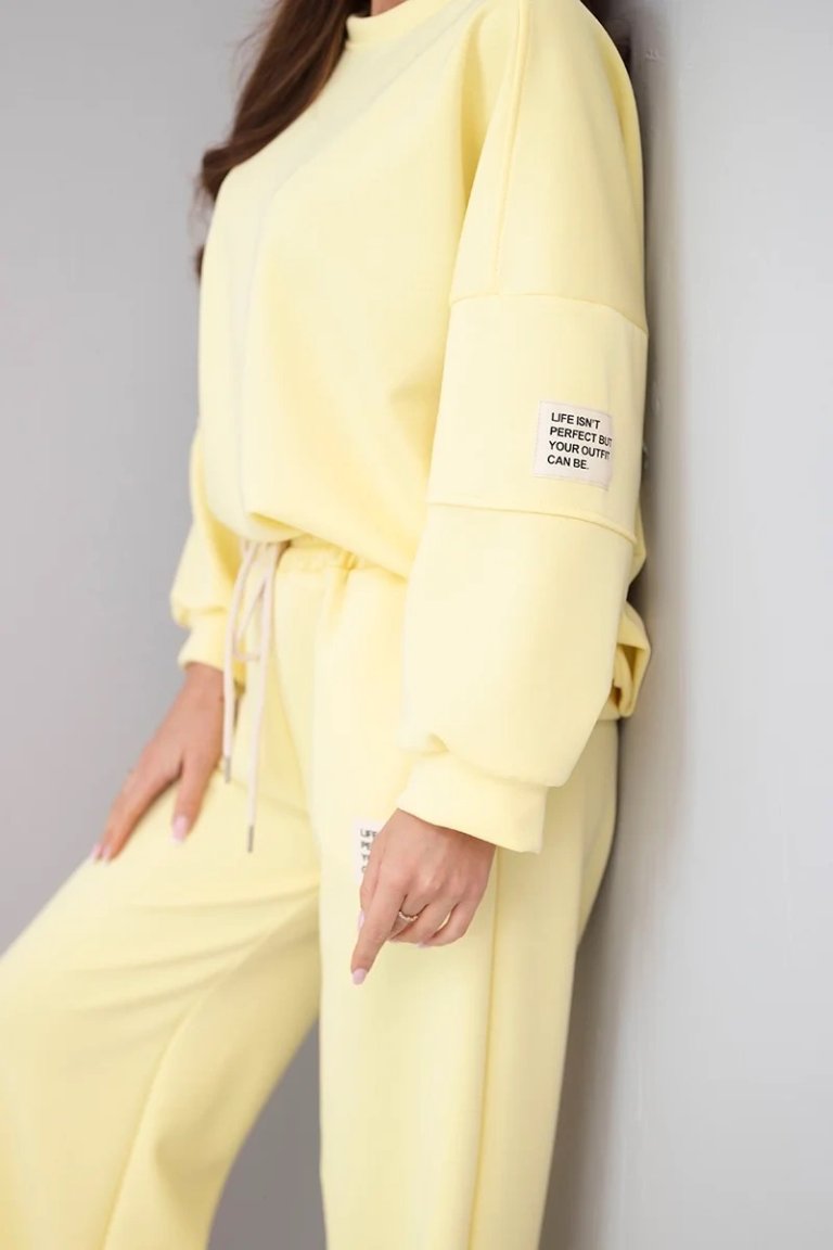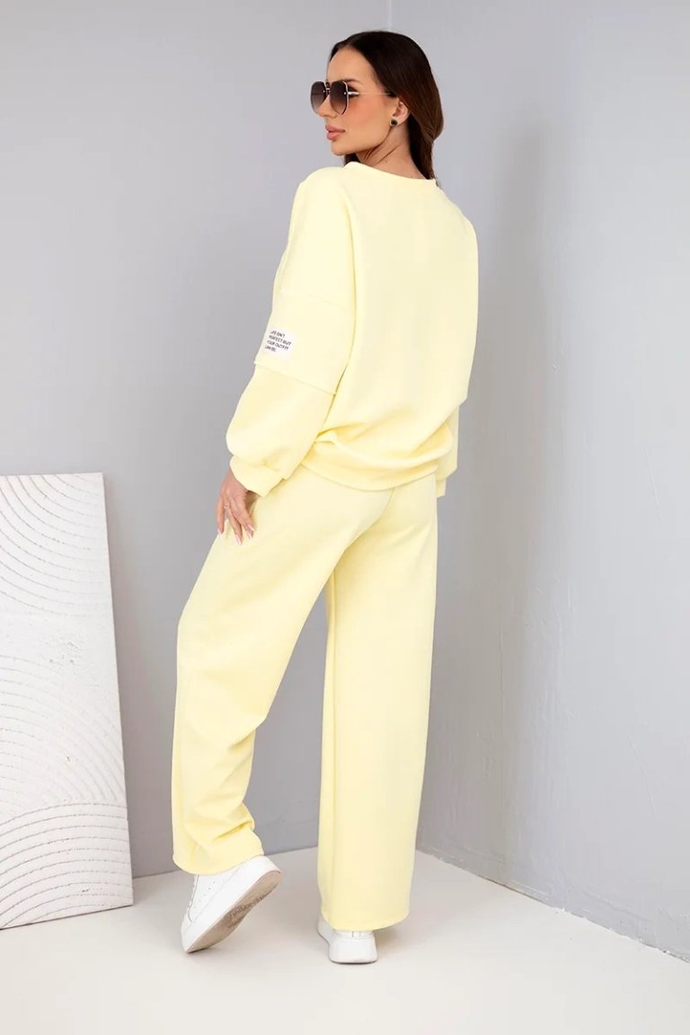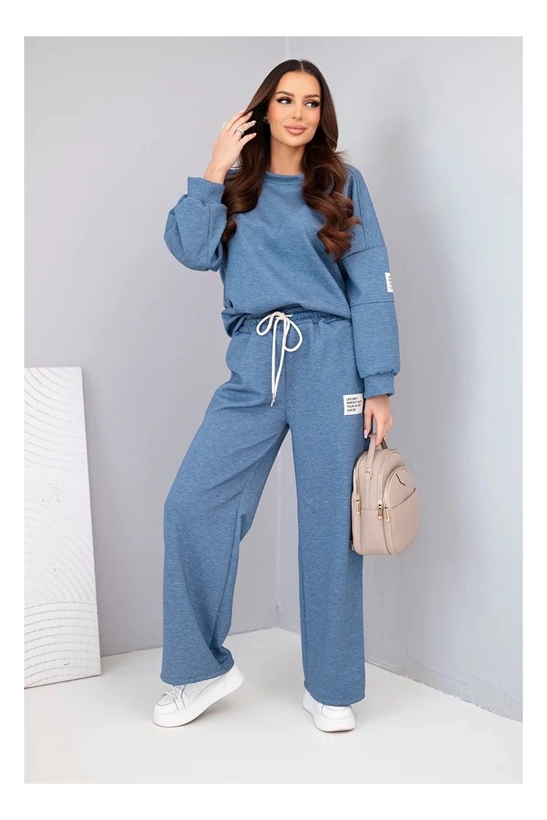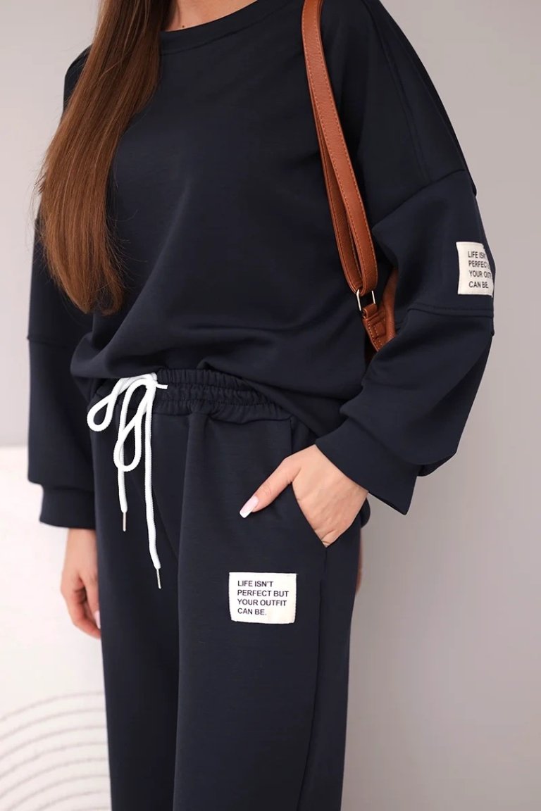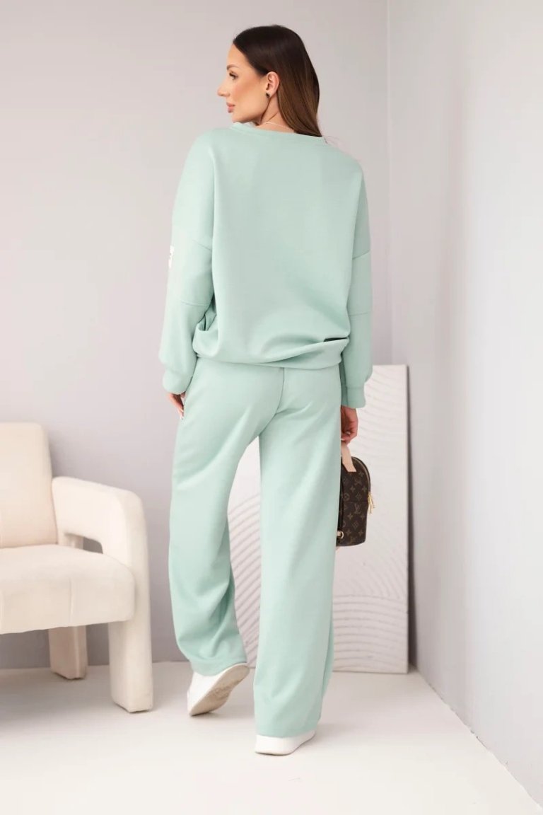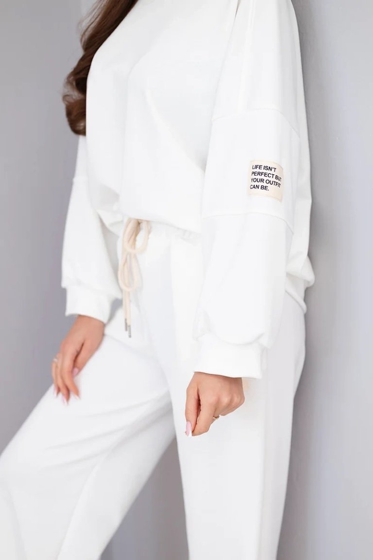 Tepláková súprava Astrid. Dámska pohodlná tepláková súprava s mikinou voľného strihu so spustenou líniou ramien a pohodlné nohavice so širokým strihom. Súprava je vyrobená z kvalitného a príjemného materiálu. Je univerzálnej veľkosti, takže by mala byť vhodná pre ženy, ktoré nosia veľkosť S, M a L.
