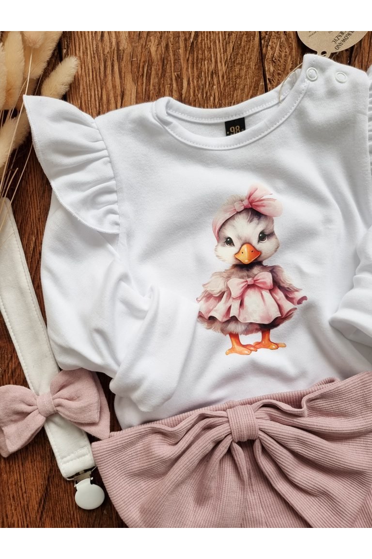 Body s volánikmi a kačičkou. Detské bavlnené body s volánmi na rukávoch a s roztomilou potlačou kačičky. Body je vyrobené z kvalitnej bavlny, jemnej na dotyk a šetrnej k detskej pokožke. Vyrobené v EÚ.