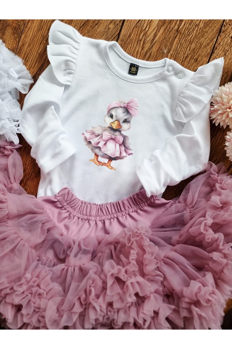 Body s volánikmi a kačičkou. Detské bavlnené body s volánmi na rukávoch a s roztomilou potlačou kačičky. Body je vyrobené z kvalitnej bavlny, jemnej na dotyk a šetrnej k detskej pokožke. Vyrobené v EÚ.